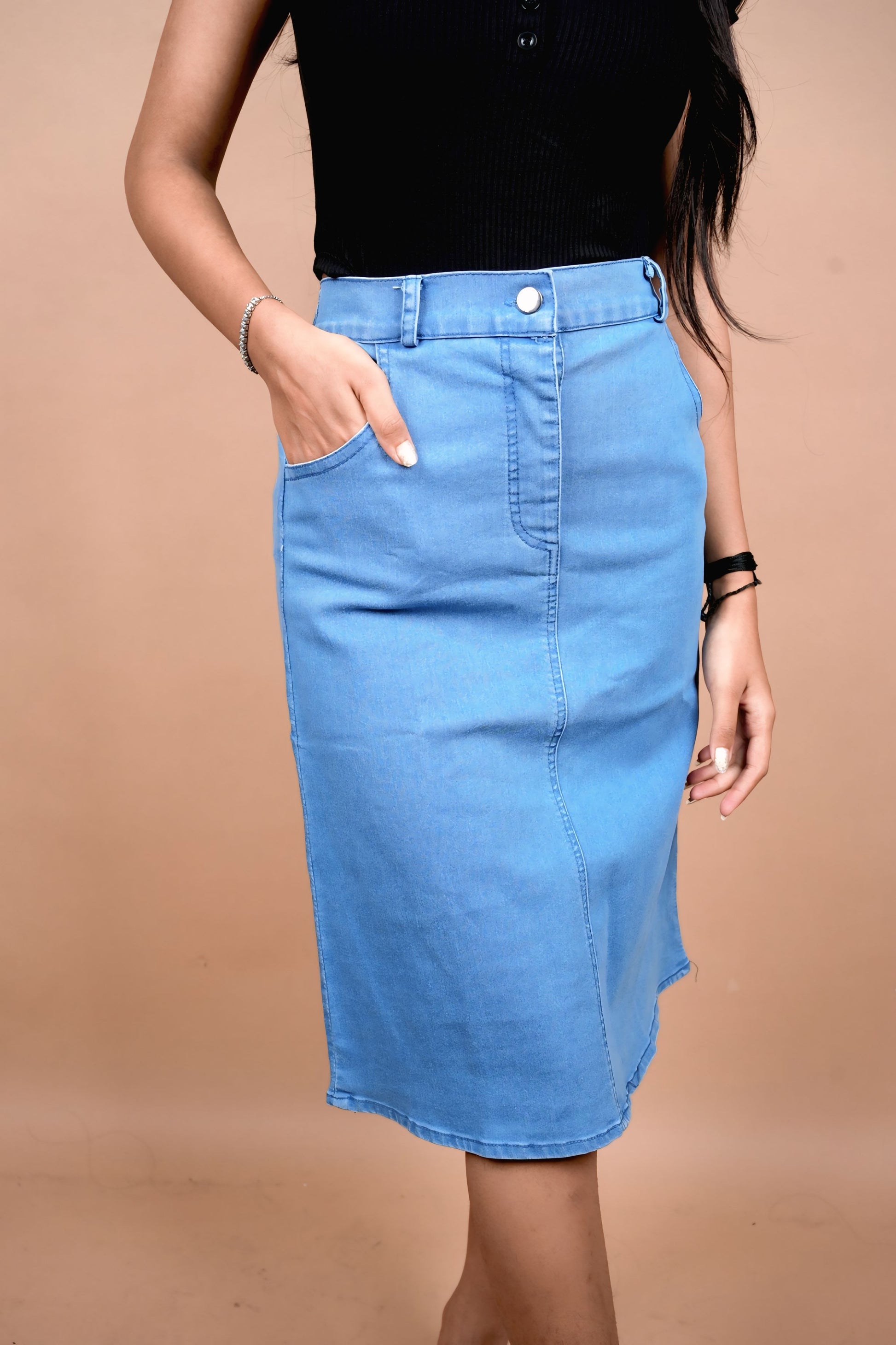 This light blue denim pencil skirt offers a tailored fit that enhances your silhouette with a sleek, professional look. Crafted from durable denim, it combines comfort with structure, making it ideal for both office wear and casual outings. Its classic color and clean lines provide versatile styling options, allowing you to pair it effortlessly with blouses or jackets for a polished appearance.